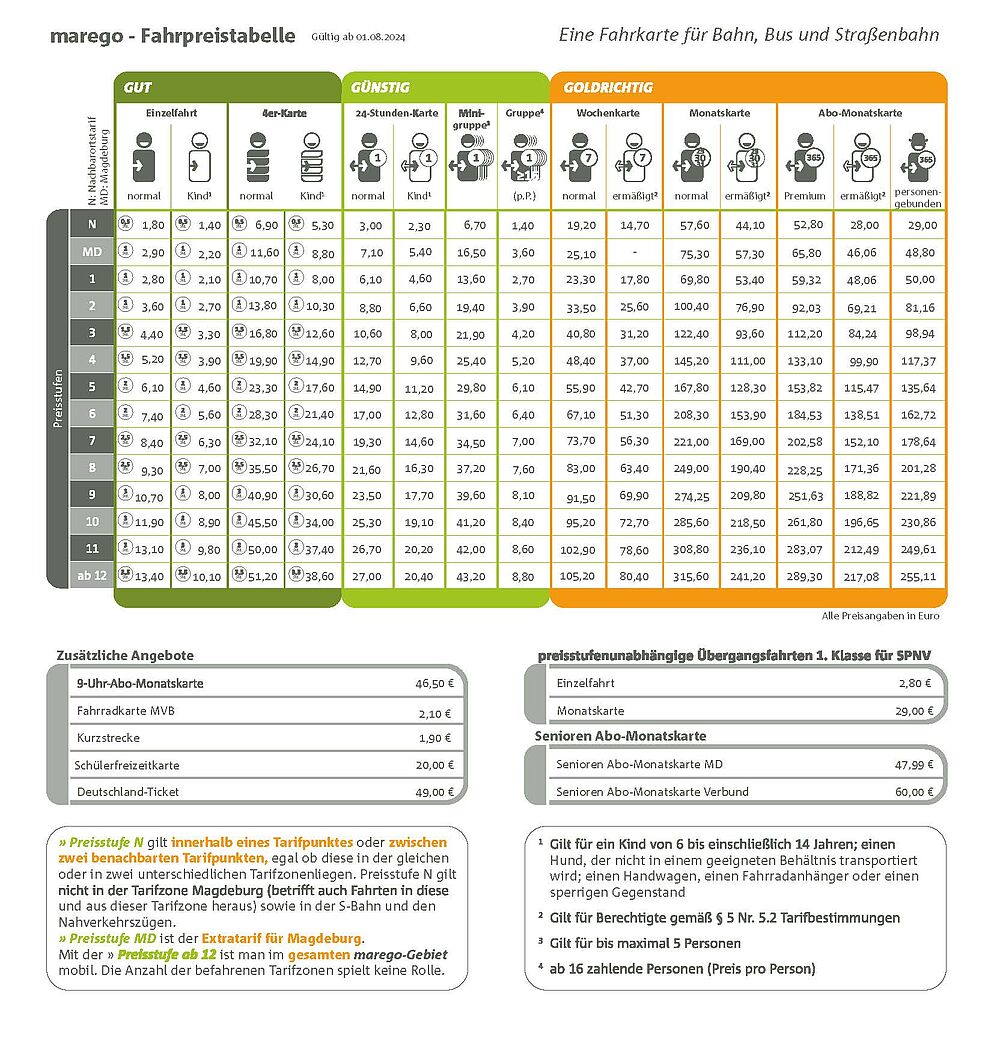 Bitte beachten Sie, dass die Preisstufe N speziell für Fahrten in kleineren Orten innerhalb des marego-Gebiets konzipiert ist. Für Fahrten, die Sie in, von oder nach Magdeburg unternehmen möchten, ist die Preisstufe N nicht gültig. Magdeburg ist eine größere Stadt und erfordert daher eine separate Fahrkarte, um die öffentlichen Verkehrsmittel in dieser Tarifzone zu nutzen.