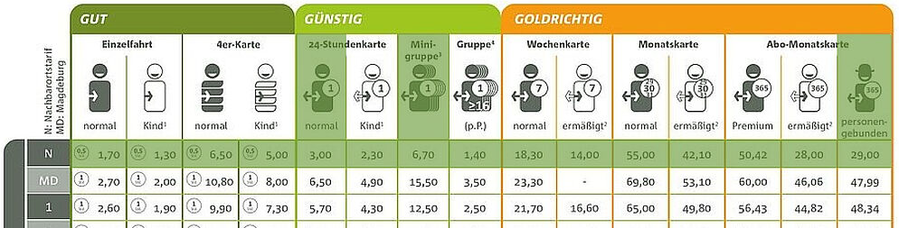 Einschränkungen: Bei Fahrten von, nach und innerhalb der Tarifzone Magdeburg sowie für Fahrten in den S-Bahnen und den Nahverkehrszügen gilt die Preisstufe N nicht.